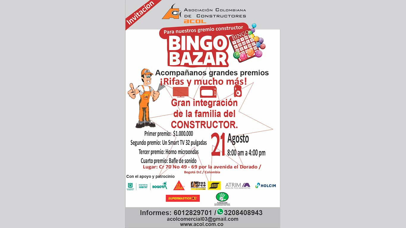 Acompáñanos en la gran integración para la familia del constructor, el próximo 21 de agosto a partir de las 8:00 a.m. Rifas, grandes premios y mucho más en nuestro espectacular Bingo Bazar. Te esperamos en la Carrera 70 # 49 – 69 por la avenida El Dorado para que disfrutes de la zona de comidas, feria inmobiliaria y visites los diferentes stands.